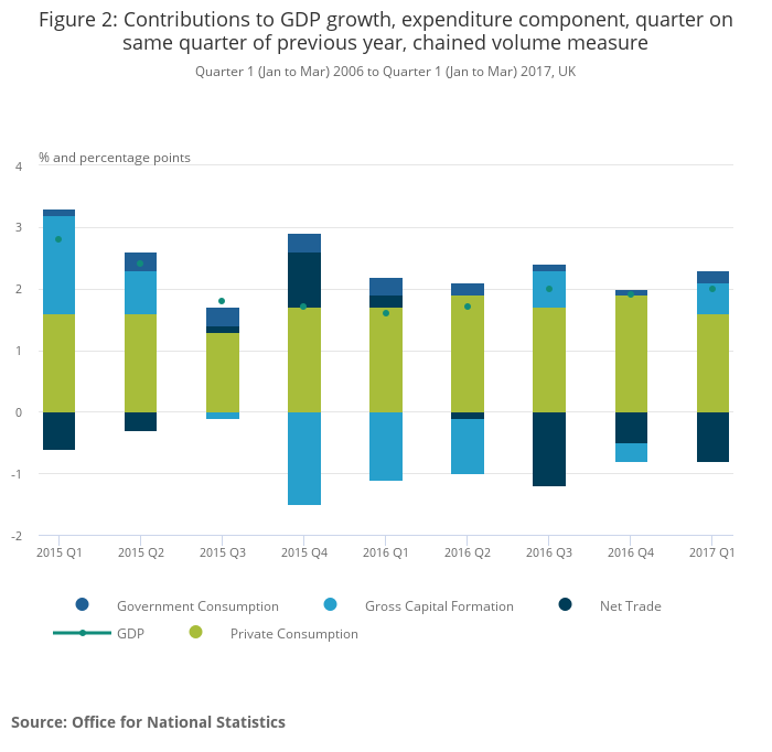 The slowdown in economic growth was mainly due to some consumer-facing services, such as retail and accommodation, while manufacturing and construction grew slowly. Business services and finances, meanwhile, continued to grow strongly. Net trade continued to provide a negative contribution to gross domestic product (GDP) growth in Quarter 1 (Jan to Mar) 2017 while household spending growth slowed.