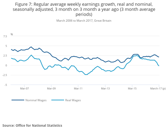 Real average weekly earnings increased by 0.1% including bonuses in the 3 months to March 2017, but fell by 0.2% excluding bonuses, compared with a year earlier.