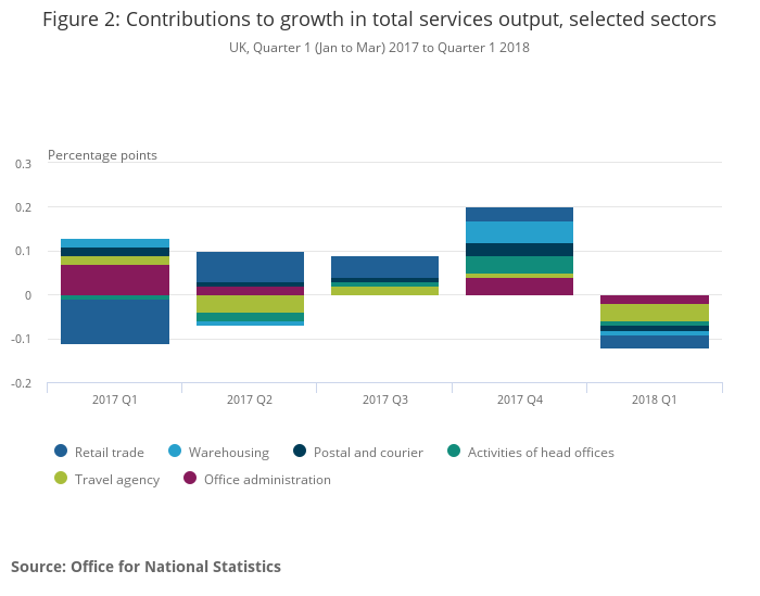 The UK economy grew by 0.1% in Quarter 1 (Jan to Mar) 2018, unrevised from the preliminary estimate. The latest evidence shows that while adverse weather conditions in Quarter 1 2018 had a negative impact on some areas of the economy, such as construction and parts of retail trade, its overall impact was limited with the bad weather also boosting energy supply and online sales.
