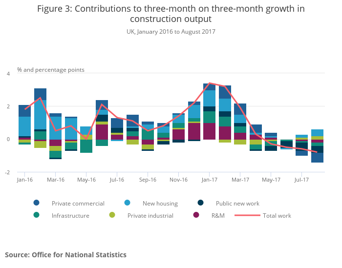 In contrast, the preliminary estimate of construction shows that total output volumes fell by 0.7% in Quarter 3 (July to Sept) 2017 – the largest quarterly fall since Quarter 3 2012. The preliminary estimate is based on forecasts and early responses to the September Monthly Business Survey and a breakdown of the components of construction is not available until 10 November 2017.