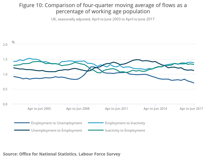 Image .csv .xlsFigure 10 compares four-quarter moving average flows as a percentage of working age population since April to June 2003 with the latest available period (April to June 2017). In the three months to June 2017, on average 459,000 people (1.12% of the working age population) moved from unemployment to employment every three months, whereas 290,000 people (0.70% of the working age population) moved from employment to unemployment, the lowest since the earliest comparable period in 2001.
