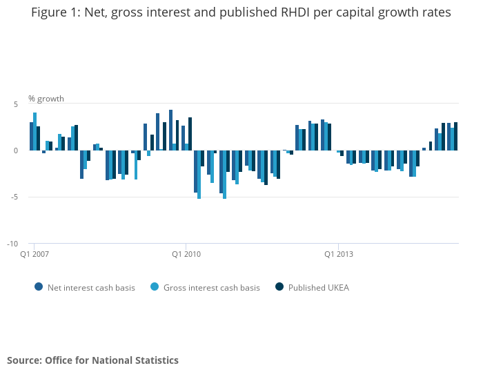 The reason that the gross interest measure shows lower growth than the other "net" measures is that the gross interest measure excludes interest paid by households and NPISH from its calculation of income. So, when interest rates fell in 2008 and 2009, this measure recorded the fall in interest received by households but not the corresponding fall in interest paid by households. As the base rate has remained at 0.5% there has been little opportunity for the gross interest measure to show stronger growth than the other measures.