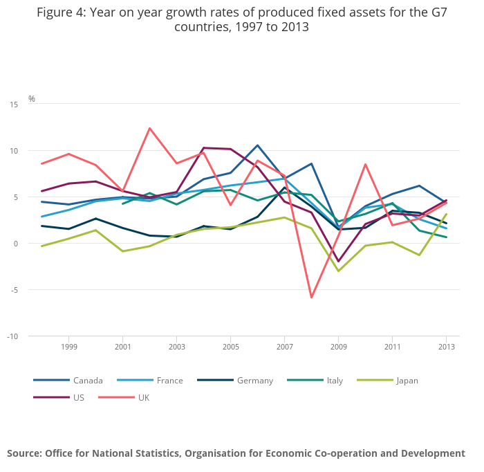 Figure 4: Year on year growth rates of produced fixed assets for the G7 countries, 1997 to 2013