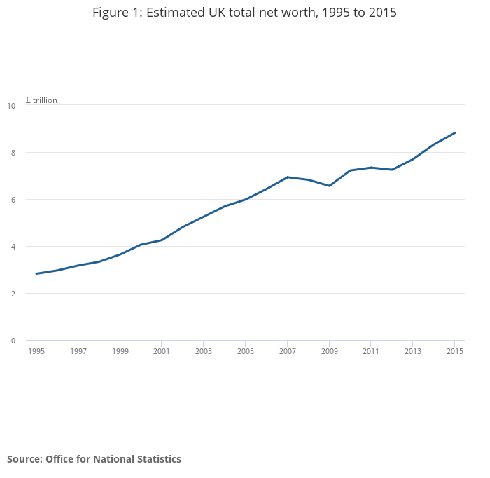 At the end of 2015, the UK was valued at an estimated £8.8 trillion, an increase of 6% (£493 billion) compared with the end of 2014, which continued the long-term pattern.