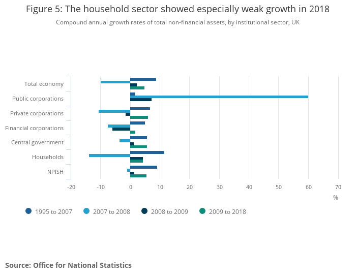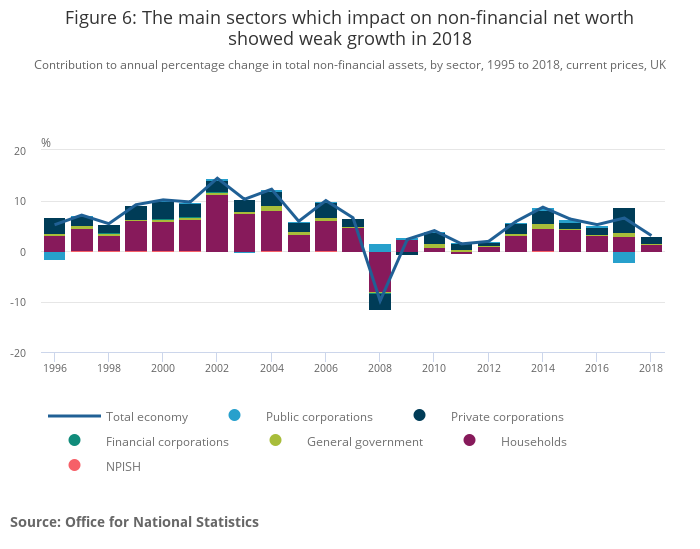 The weaker growth in non-financial assets during 2018 was reflected by most sectors, with only non-profit institutions serving households (NPISH) and public corporations showing better than UK average growth since 2009. These two sectors have little impact on the total growth as they contain relatively few non-financial assets compared with other sectors.
