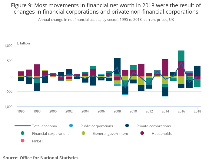 Annual change in net financial assets, by sector, 1995 to 2018, current prices, UK