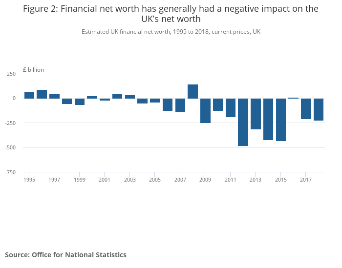 In 2018, financial net worth dropped by 7.7% or £16 billion to negative £224 billion, with large decreases in equity and investment fund shares being substantially offset by increases in currencies and deposits.
