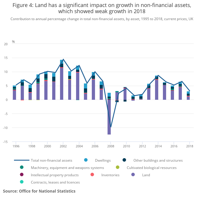 Image .csv .xlsThe rise in UK net worth was the result of increases in the value of non-financial assets which rose by £313 billion in 2018 to £10.6 trillion. The main asset contributing to this rise was land which rose by £125 billion, while buildings also had a large impact with dwellings and other buildings and structures rising by £85 billion and £67 billion respectively.