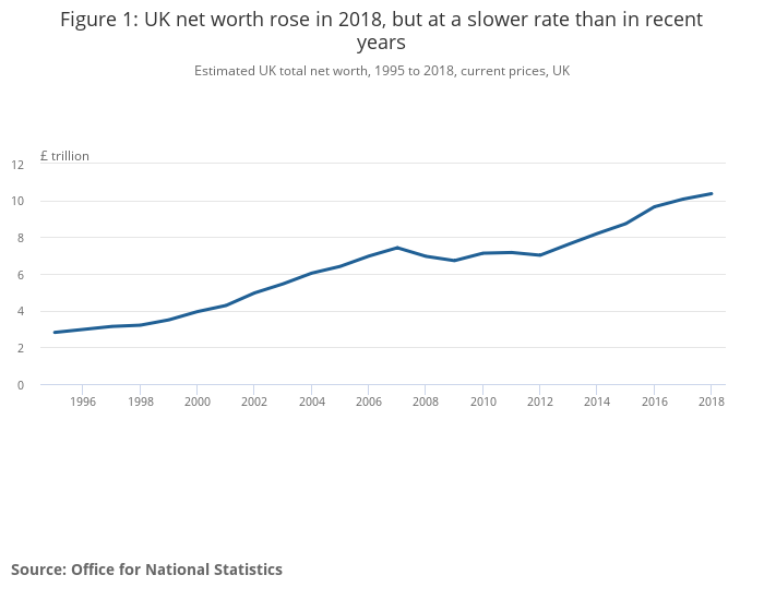 The UK’s net worth was estimated at £10.4 trillion in 2018, an average of £156,000 per person.