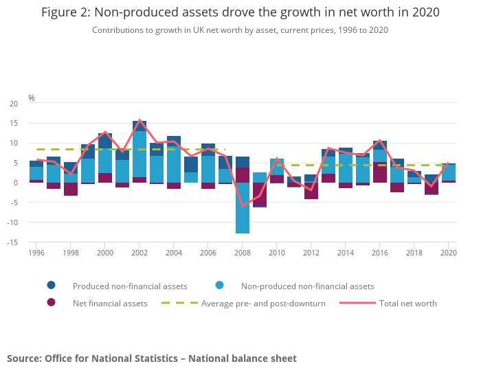Growth in the UK's net worth was revised up by 0.6 percentage points to 5.0% in 2020 since the preliminary estimate; this surpassed the post-2008 global economic downturn average growth of 4.3%.