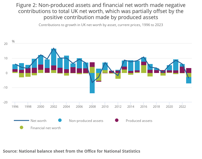 Non-produced assets accounted for negative 4.2 percentage points in the decline of the UK's net worth and financial net worth contributed negative 2.8 percentage points. The decline in non-produced assets was caused by a fall of 7.4% in the value of land. This is the first negative growth in land value since 2011. This is caused by the annual change in average house prices being negative 2.7% in 2023, as shown in HM Land Registry's UK House Price Index data downloads September 2024.