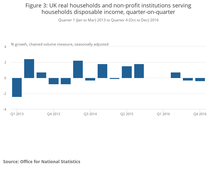 The level of real households and NPISH disposable income (RHDI) fell by 0.4% in Quarter 4 2016, following a fall of 0.3% in the previous quarter.