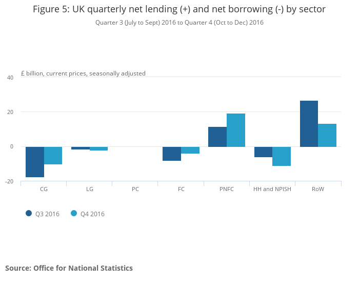 On a quarterly basis, households and NPISH net borrowing of £11.1 billion in Quarter 4 2016 is the highest net borrowing recorded by the sector since comparable records began in 1987. In Quarter 4 2016, central government net borrowing of £10.2 billion was the lowest net borrowing recorded by this sector since Quarter 2 (Apr to June) 2007, when it was £9.7 billion.