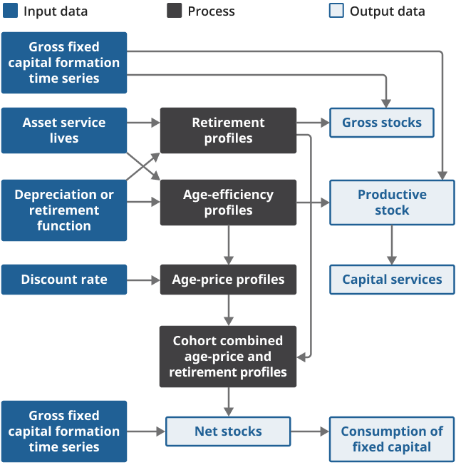 Download this image Figure 1: The process used to calculate estimates of capital stocks and consumption of fixed capital, following the perpetual inventory method