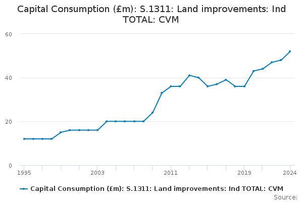Download this time seriesCapital Consumption (£m): S.1311: Land improvements: Ind TOTAL: CVM