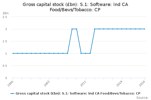 Download this time seriesGross capital stock (£bn): S.1: Software: Ind CA Food/Bevs/Tobacco: CP