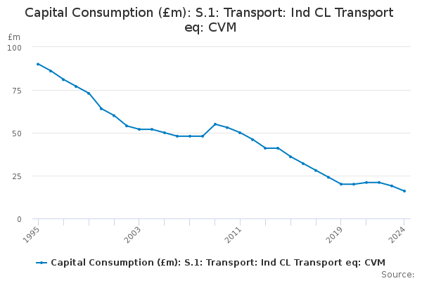 Download this time seriesCapital Consumption (£m): S.1: Transport: Ind CL Transport eq: CVM