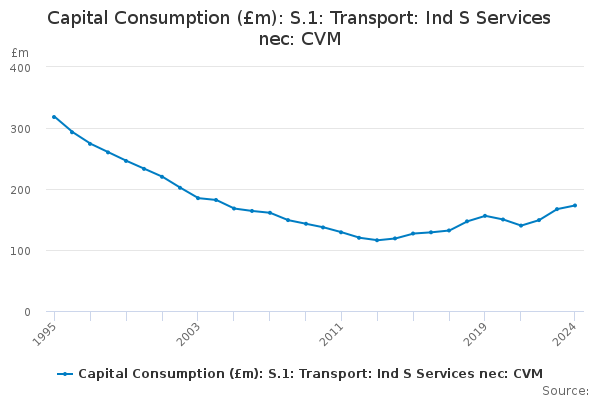 Download this time seriesCapital Consumption (£m): S.1: Transport: Ind S Services nec: CVM
