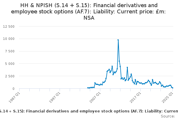Download this time seriesHH & NPISH (S.14 + S.15): Financial derivatives and employee stock options (AF.7): Liability: Current price: £m: NSA