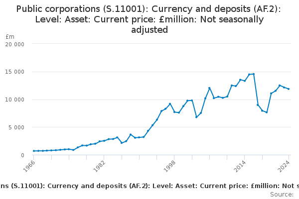 Download this time seriesPublic corporations (S.11001): Currency and deposits (AF.2): Level: Asset: Current price: £million: Not seasonally adjusted