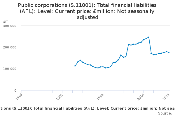 Download this time seriesPublic corporations (S.11001): Total financial liabilities (AF.L): Level: Current price: £million: Not seasonally adjusted