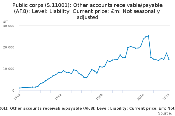 Download this time seriesPublic corps (S.11001): Other accounts receivable/payable (AF.8): Level: Liability: Current price: £m: Not seasonally adjusted