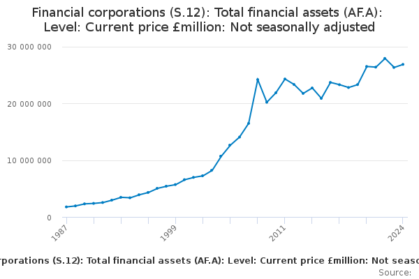 Download this time seriesFinancial corporations (S.12): Total financial assets (AF.A): Level: Current price £million: Not seasonally adjusted