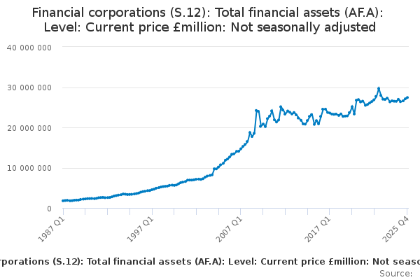 Download this time seriesFinancial corporations (S.12): Total financial assets (AF.A): Level: Current price £million: Not seasonally adjusted