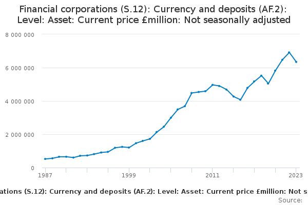 Download this time seriesFinancial corporations (S.12): Currency and deposits (AF.2): Level: Asset: Current price £million: Not seasonally adjusted