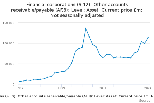 Download this time seriesFinancial corporations (S.12): Other accounts receivable/payable (AF.8): Level: Asset: Current price £m: Not seasonally adjusted