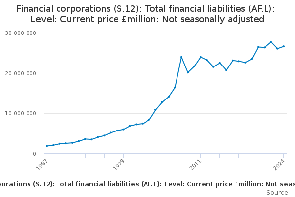 Download this time seriesFinancial corporations (S.12): Total financial liabilities (AF.L): Level: Current price £million: Not seasonally adjusted