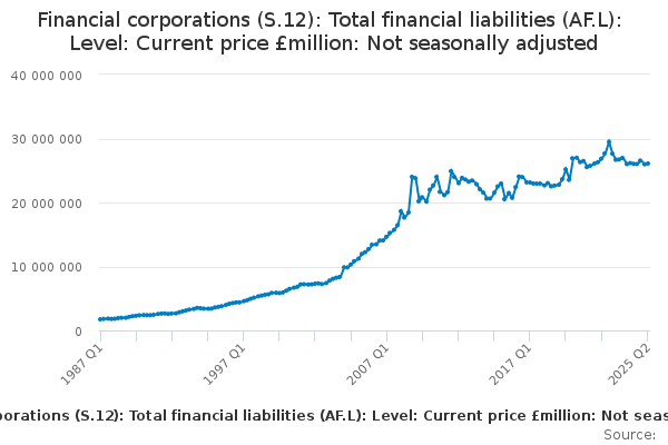 Download this time seriesFinancial corporations (S.12): Total financial liabilities (AF.L): Level: Current price £million: Not seasonally adjusted