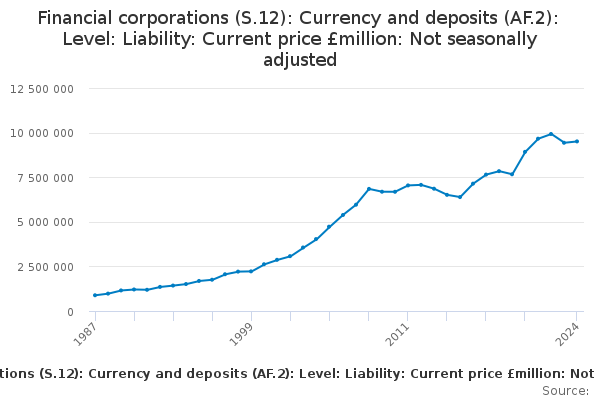 Download this time seriesFinancial corporations (S.12): Currency and deposits (AF.2): Level: Liability: Current price £million: Not seasonally adjusted