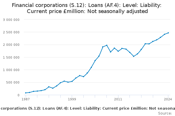 Download this time seriesFinancial corporations (S.12): Loans (AF.4): Level: Liability: Current price £million: Not seasonally adjusted
