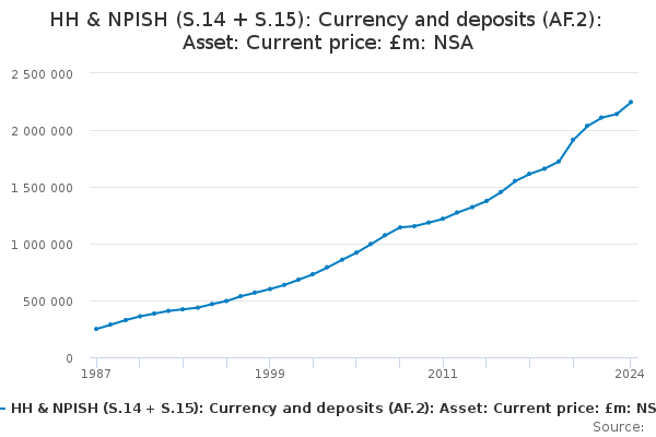 Download this time seriesHH & NPISH (S.14 + S.15): Currency and deposits (AF.2): Asset: Current price: £m: NSA