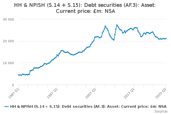 Download this time seriesHH & NPISH (S.14 + S.15): Debt securities (AF.3): Asset: Current price: £m: NSA
