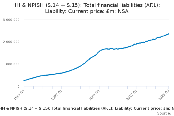 Download this time seriesHH & NPISH (S.14 + S.15): Total financial liabilities (AF.L): Liability: Current price: £m: NSA