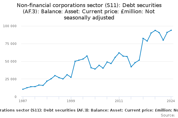 Download this time seriesNon-financial corporations sector (S11): Debt securities (AF.3): Balance: Asset: Current price: £million: Not seasonally adjusted