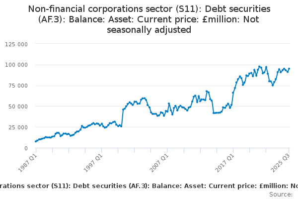 Download this time seriesNon-financial corporations sector (S11): Debt securities (AF.3): Balance: Asset: Current price: £million: Not seasonally adjusted