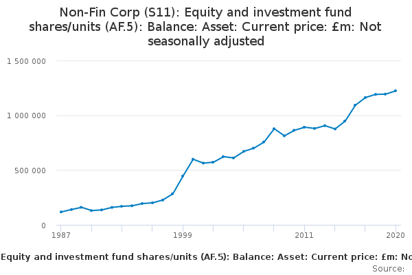 Download this time seriesNon-Fin Corp (S11): Equity and investment fund shares/units (AF.5): Balance: Asset: Current price: £m: Not seasonally adjusted