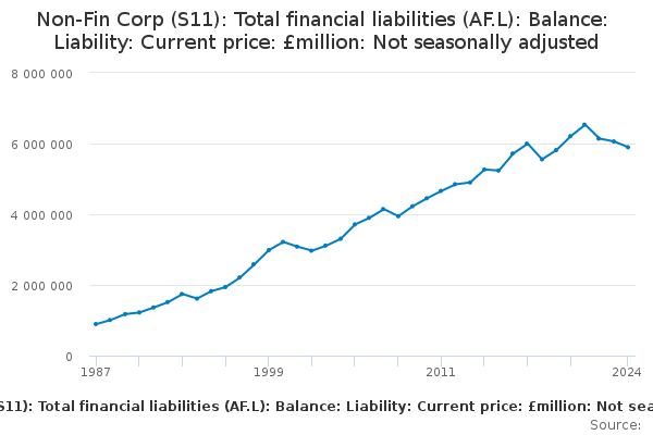 Download this time seriesNon-Fin Corp (S11): Total financial liabilities (AF.L): Balance: Liability: Current price: £million: Not seasonally adjusted