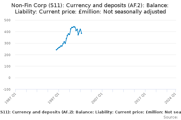 Download this time seriesNon-Fin Corp (S11): Currency and deposits (AF.2): Balance: Liability: Current price: £million: Not seasonally adjusted