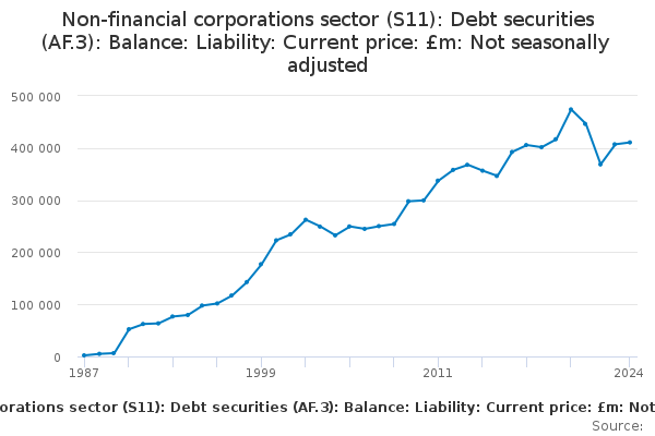 Download this time seriesNon-financial corporations sector (S11): Debt securities (AF.3): Balance: Liability: Current price: £m: Not seasonally adjusted