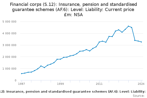 Download this time seriesFinancial corps (S.12): Insurance, pension and standardised guarantee schemes (AF.6): Level: Liability: Current price £m: NSA