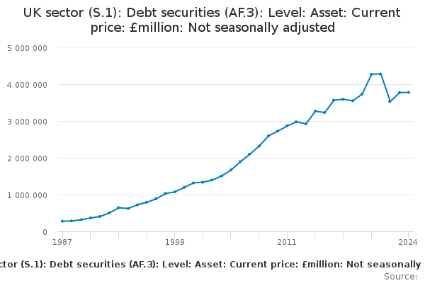 Download this time seriesUK sector (S.1): Debt securities (AF.3): Level: Asset: Current price: £million: Not seasonally adjusted