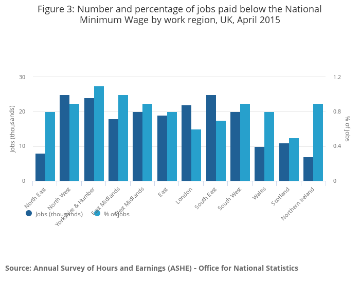 Figure 3: Number and percentage of jobs paid below the National Minimum Wage by work region, UK, April 2015