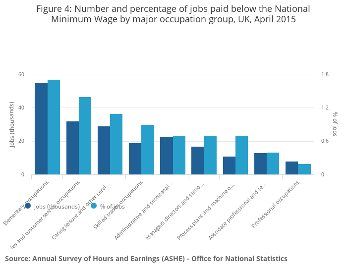 Figure 4: Number and percentage of jobs paid below the National Minimum Wage by major occupation group, UK, April 2015