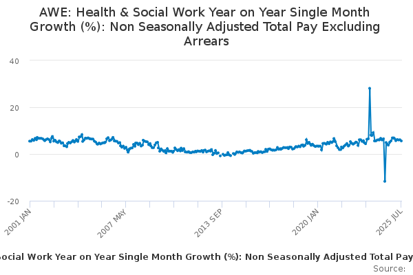Download this time seriesAWE: Health & Social Work Year on Year Single Month Growth (%): Non Seasonally Adjusted Total Pay Excluding Arrears