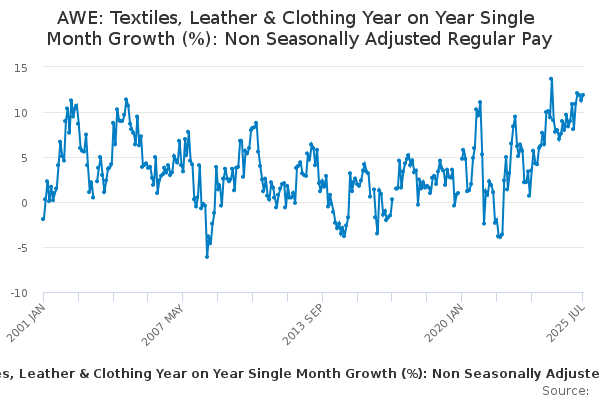 Download this time seriesAWE: Textiles, Leather & Clothing Year on Year Single Month Growth (%): Non Seasonally Adjusted Regular Pay