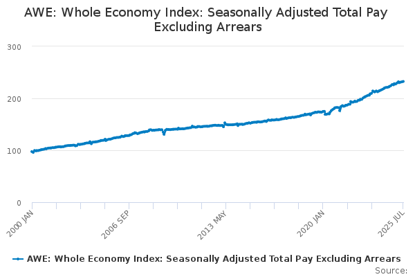 Download this time seriesAWE: Whole Economy Index: Seasonally Adjusted Total Pay Excluding Arrears
